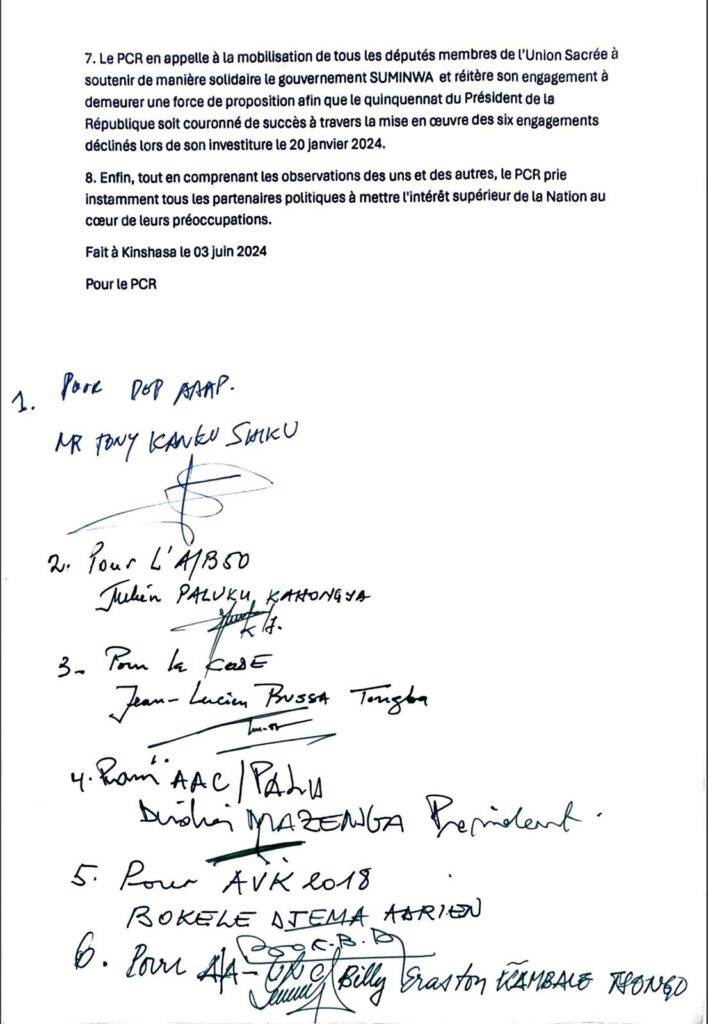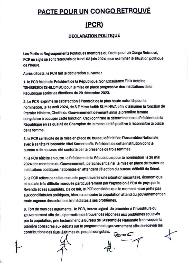 Dans une déclaration politique fait le 03 juin à Kinshasa, cette plate forme, avec comme leaders Vital Kamerhe, Tony Kanku Shiku, Julien Paluku et Jean Lucien Bussa, a fait le tour de la situation politique de l’heure qui, après débat, a pu produire quelques recommandations sur la marche du pays. Voici la déclaration politique du PCR.